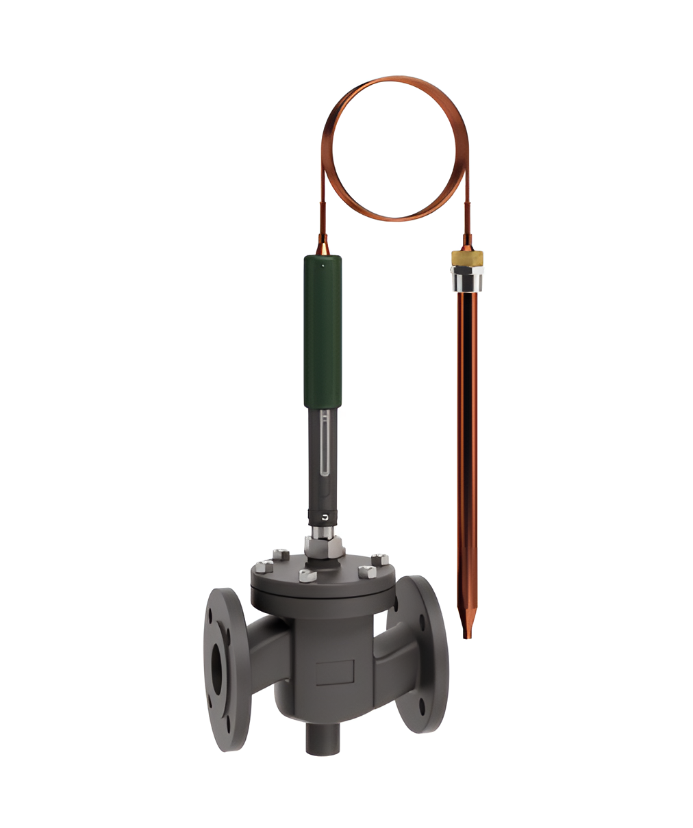 The temperature controller, which consists of a thermostat and a valve, is used for controlling the temperature in central heating systems, district heating systems, industrial plants or industrial processes and in marine systems. It can be used for the control of cold or hot water, steam or oil in heating as well as cooling systems.